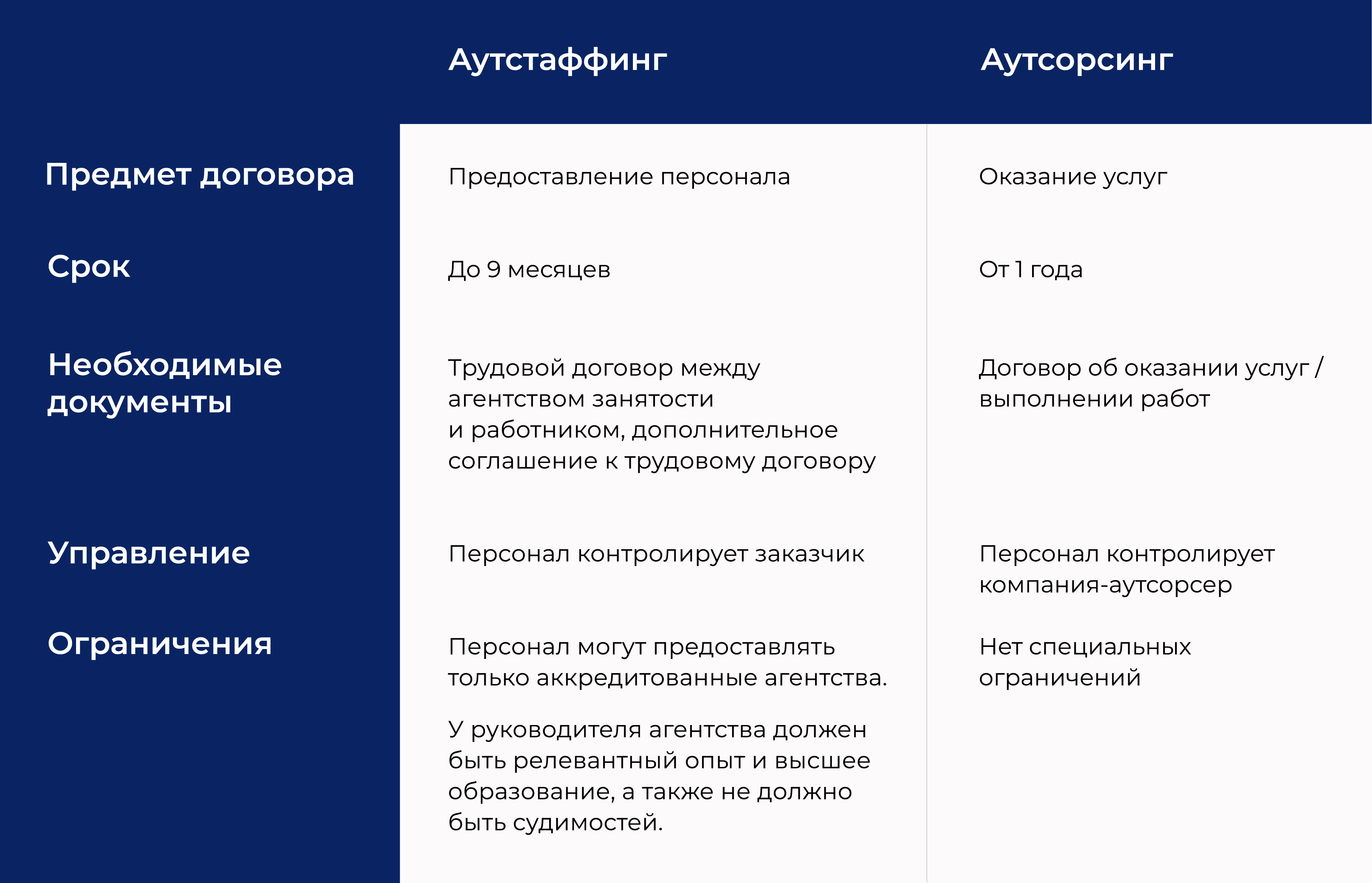 Отличие аутсорсинга от аутстаффинга: таблциа